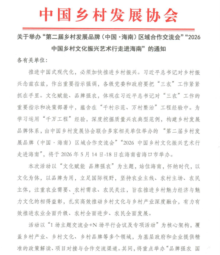 推进中国式现代化,必须加快推进乡村振兴。习近平总书记对乡村振兴念兹在兹,作出重要指示强调,各级党委和政府要把“三农”工作紧紧抓在手里。文化赋能、品牌强农,体现在习近平总书记对“三农”工作的重要指示和决策部署中,蕴含在“千村示范、万村整治”工程经验中。为学习运用“千万工程”经验,深度挖掘质量兴农典型范例,构建乡村发展品牌体系,由中国乡村发展协会联合多家相关单位举办的 “第二届乡村发展品牌(中国·海南)区域合作交流会”“2026 中国乡村文化振兴艺术行走进海南”,将于2026年5月14日-18日在海南省海口市举办。