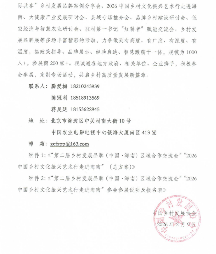 附件2:《“第二届乡村发展品牌(中国·海南)区域合作交流会”“2026 中国乡村文化振兴艺术行走进海南”参会参展说明及报名表》