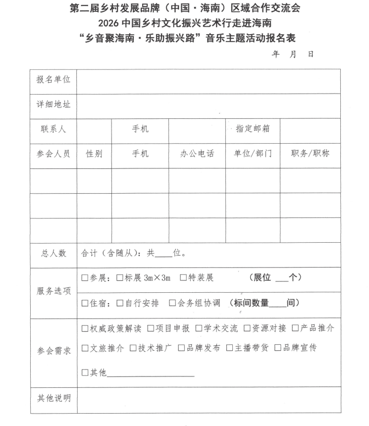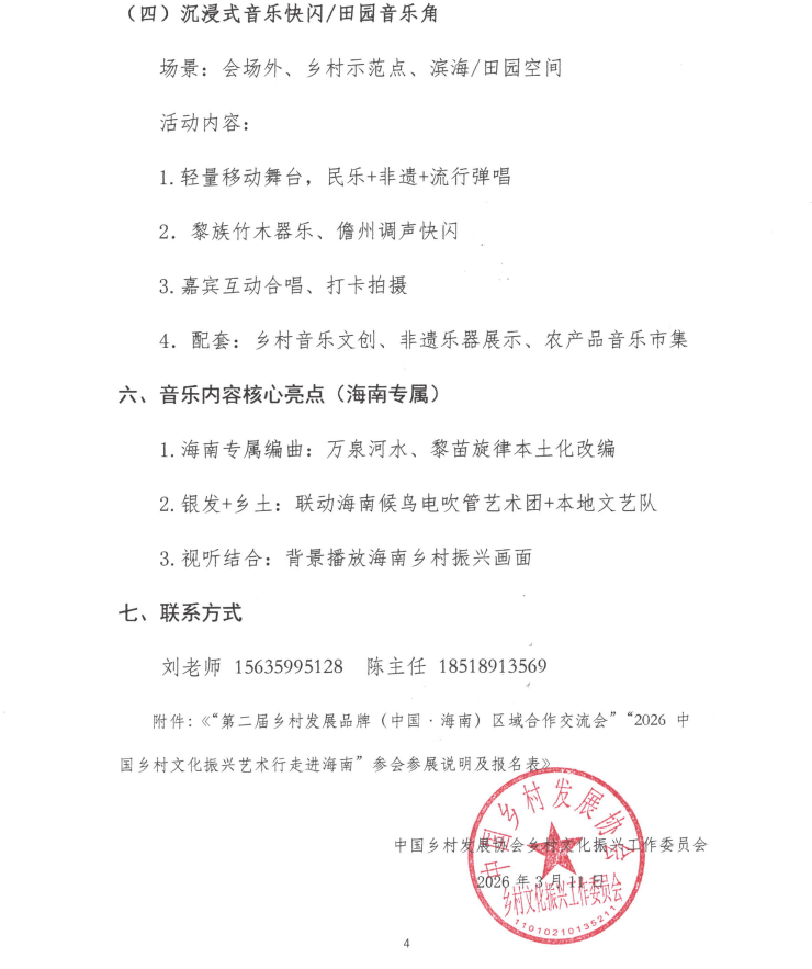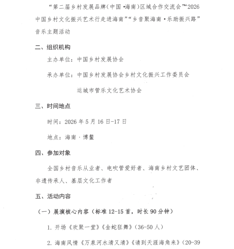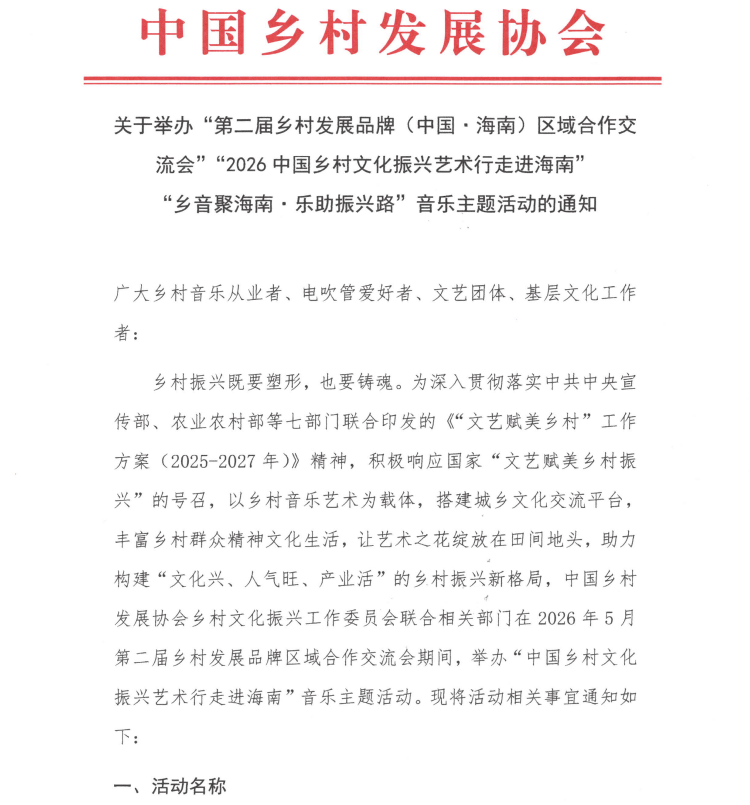 关于举办“第二届乡村发展品牌(中国·海南)区域合作交流会”“2026中国乡村文化振兴艺术行走进海南”“乡音聚海南·乐助振兴路”音乐主题活动的通知