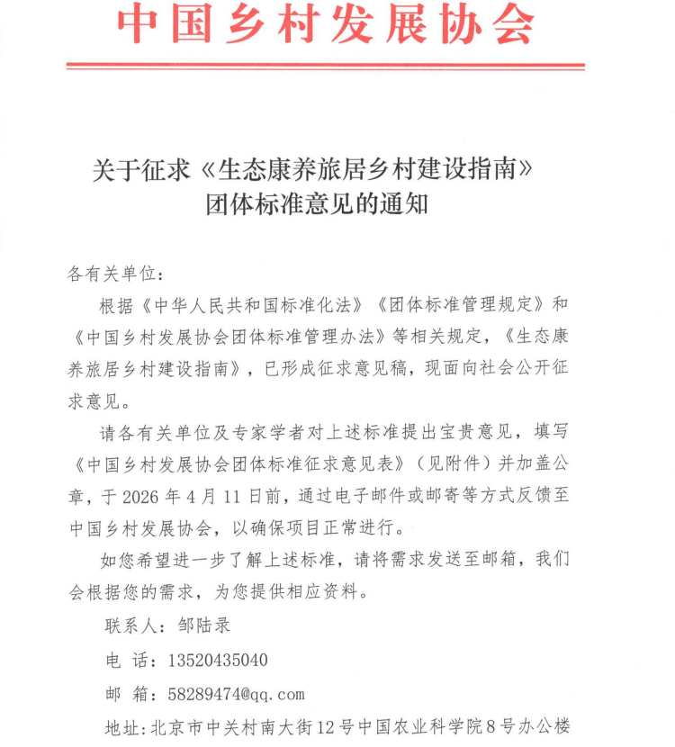 关于征求《生态康养旅居乡村建设指南》团体标准意见的通知