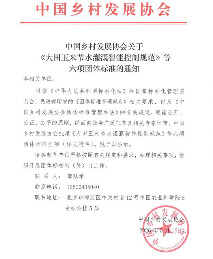 中国乡村发展协会关于《大田玉米节水灌溉智能控制规范》等六项团体标准的通知