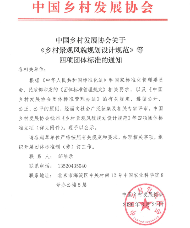 中国乡村发展协会关于《乡村景观风貌规划设计规范》等四项团体标准的通知