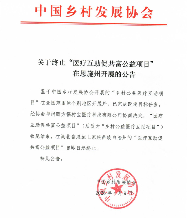 关于终止“医疗互助促共富公益项目”在恩施州开展的公告